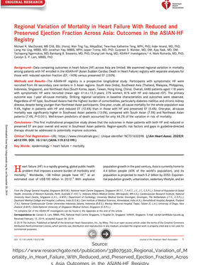 MacDonald, M.R., Tay, W.T., Teng, T.H.K., Anand, I., Ling, L.H., Yap, J., Tromp, J., Wander, G.S., Naik, A., Ngarmukos, T. and Siswanto, B.B., 2020. Regional variation of mortality in heart failure with reduced and preserved ejection fraction across Asia: outcomes in the ASIAN‐HF Registry. Journal of the American Heart Association, 9(1), p.e012199.