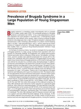 Shen X, Tan BY, Sia CH, Lee JS, Dalakoti M, Wang K, Lim DY, Sng GG, Lee EC, Chow W, Kwan CK. Prevalence of Brugada Syndrome in a Large Population of Young Singaporean Men. Circulation. 2020 Jan 14;141(2):155-7.