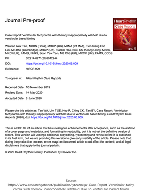 Tan WA, Lim TS, Heo R, Ching CK, Tan BY. Ventricular tachycardia with therapy inappropriately withheld due to ventricular-based timing. HeartRhythm Case Reports. 2020 Sep;6(9):622.